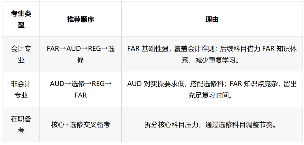 核心科目优先:FAR/AUD/REG考核范围广,优先攻克可缩短整体周期;